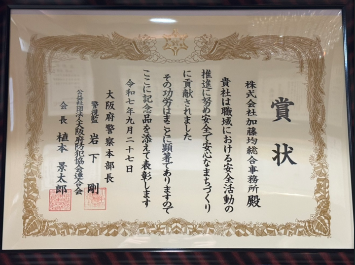 On September 27, 2025, we were honored to receive a commendation as a "Distinguished Contributor to Crime Prevention" from the Chief of the Osaka Prefectural Police Headquarters. This award recognizes our dedication to promoting safety activities within the workplace and our commitment to building a safe and secure community.